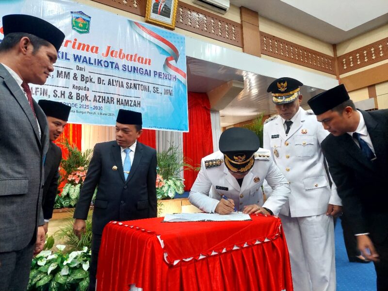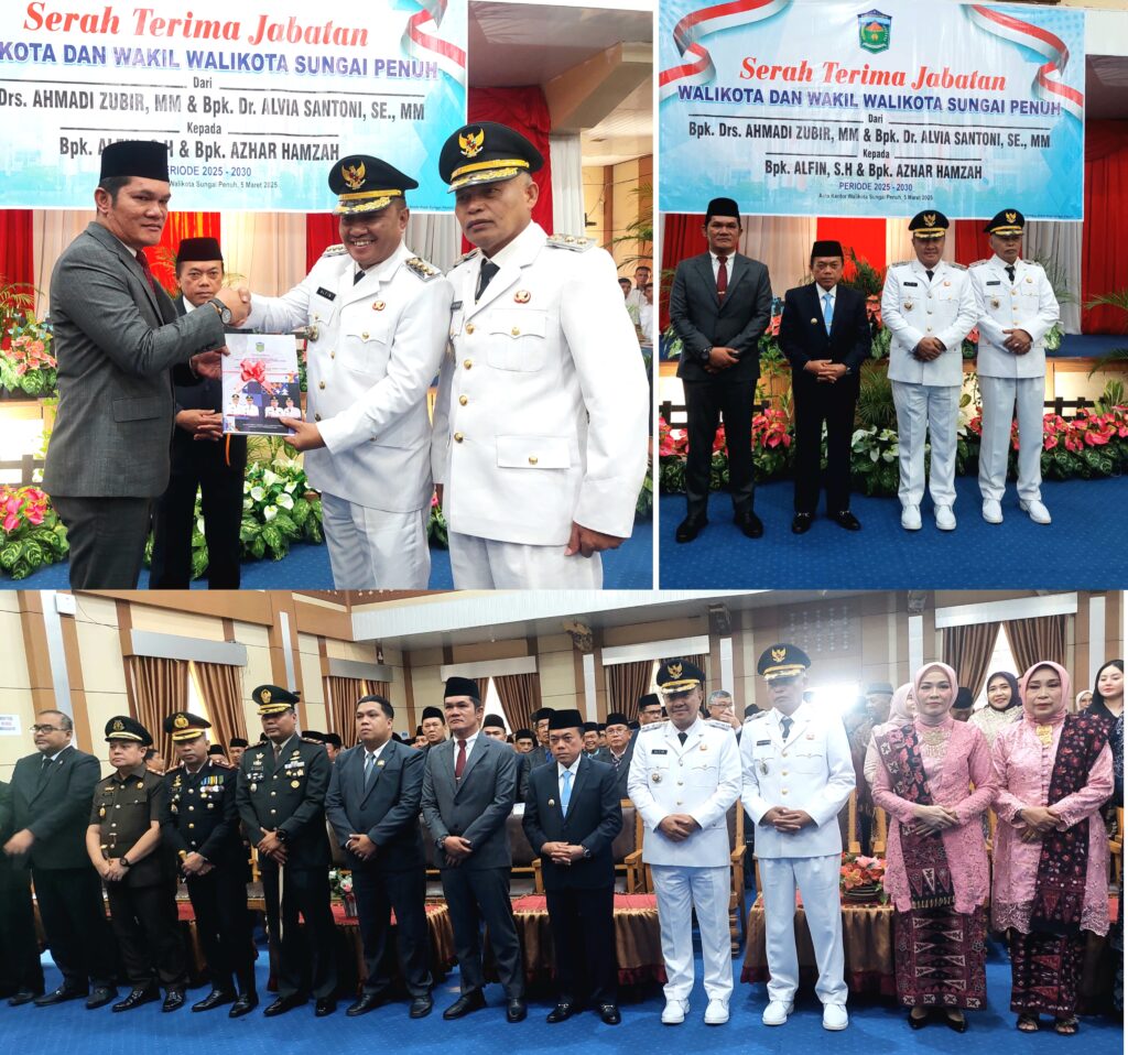 Koran Sakti.co.id, Sungai Penuh – Pemerintah Kota Sungai Penuh Menggelar Acara Serah Terima Jabatan (Sertijab) dari Walikota dan Wakil Walikota masa jabatan 2021-2024, Drs. Ahmadi Zubir, MM dan Dr. Alvia Santoni, SE, MM Kepada Walikota Alfin, SH dan Wakil Walikota Azhar Hamzah Masa Jabatan 2025-2030, Rabu (5/3) bertempat di aula gedung Walikota Sungai Penuh