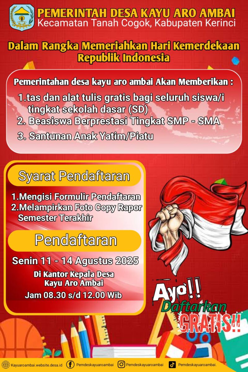 Pendaftaran dibuka mulai Senin, 11 Agustus hingga Kamis, 14 Agustus 2025, dengan datang langsung di Kantor Kepala Desa Kayu Aro Ambai pada pukul 08.30 hingga 12.00 WIB.