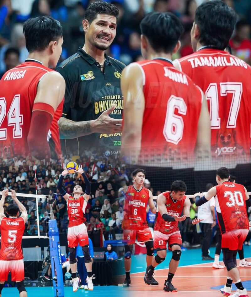 Tertinggal dua set awal, Bhayangkara bangkit dan menyapu tiga set berikutnya (19-25, 23-25, 25-22, 25-22, 15-9).