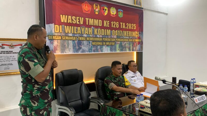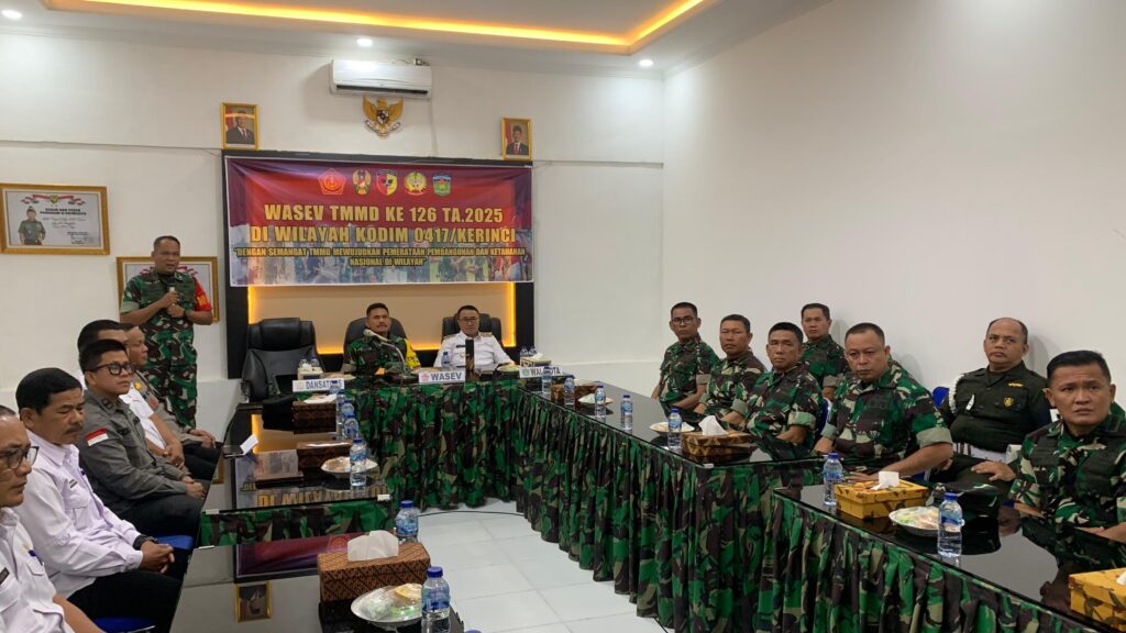 koransakti.co.id, Sungai Penuh – Komandan Kodim (Dandim) 0417/Kerinci Letkol Inf Eko Budianto M.I.P., selaku Komandan Satuan Tugas (Dansatgas) TNI Manunggal Membangun Desa (TMMD) menerima kunjungan kerja (Kunker) Tim Wasev Kolonel Inf Eben Ezer Lumban Tobing S.A.P. PABAN Sahli Kasad Bidang Politik dan Kapten Arh.Andy Ackbar T. AMD KAUR RENOPSBAK TNI SPABAN V/WILHANRAT STERAD. Ruang Data Makodim Kerinci Rabu 29/10