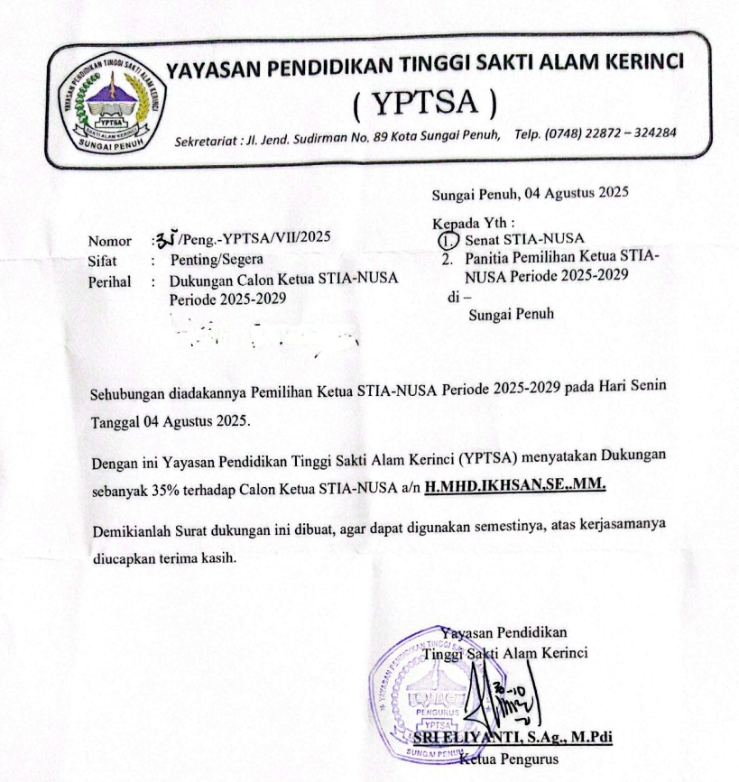 Selain meraih dukungan mayoritas Senat, H. Mhd. Ikhsan juga mendapat dukungan resmi dari Yayasan Pendidikan Tinggi Sakti Alam Kerinci (YPTSA) sebesar 35%, sebagaimana tertuang dalam surat resmi bernomor /Peng.-YPTSA/VII/2025 yang diterbitkan pada tanggal yang sama.