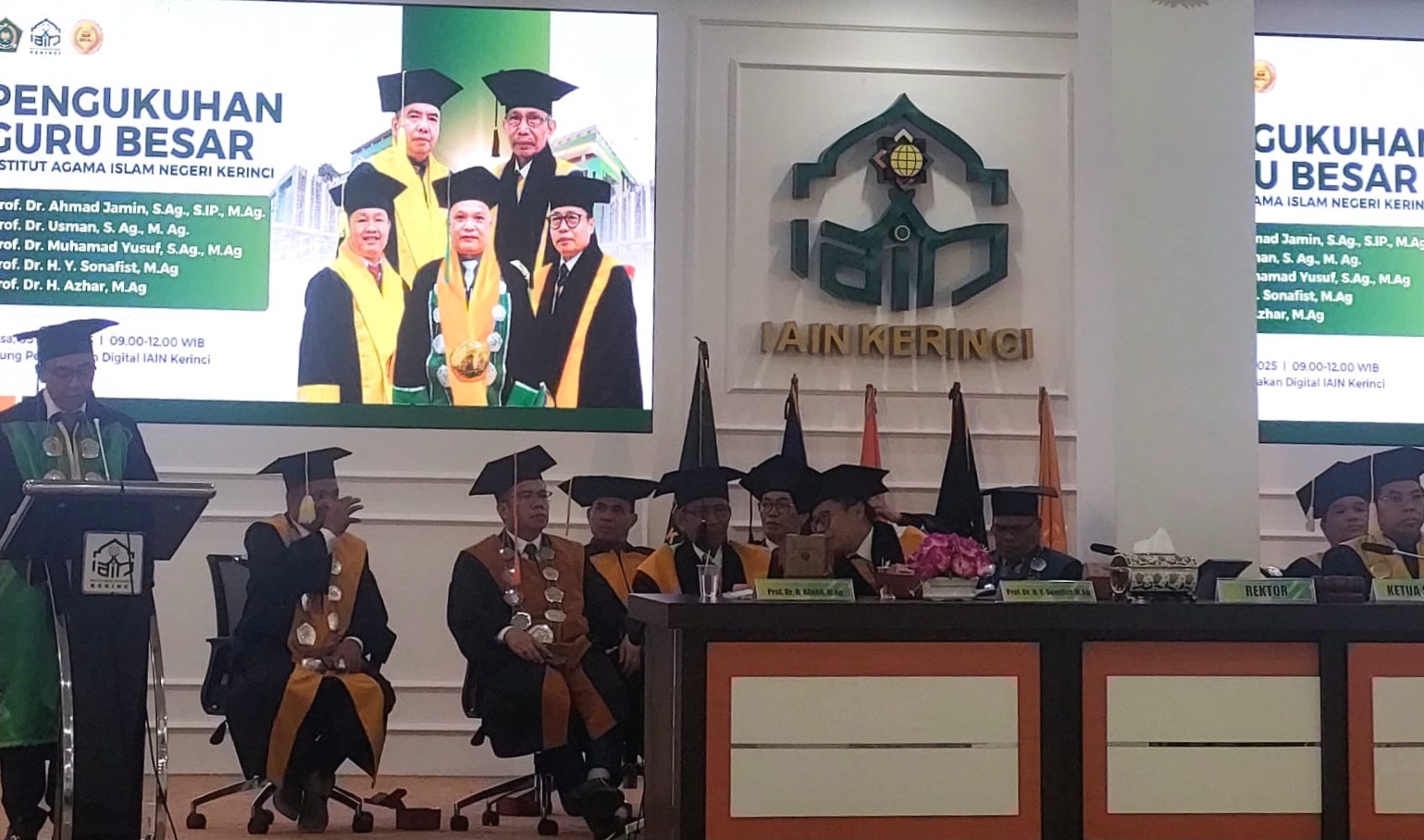 Koran Sakti.co.id, Kerinci – Institut Agama Islam Negeri (IAIN) Kerinci resmi mengukuhkan lima akademisi sebagai Guru Besar dalam sidang senat terbuka yang berlangsung di Gedung Perpustakaan Digital IAIN Kerinci, Kecamatan Pesisir Bukit Kota Sungai Penuh, Selasa (3 Juni 2025).