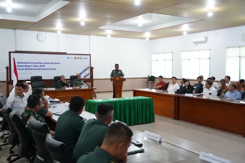 Koran Sakti.co.id, Palembang- Komitmen untuk terus mendukung Swasembada Pangan, Pangdam II/Sriwijaya Mayjen TNI Ujang Darwis, M.D.A., diwakili oleh Kasdam II/Swj Brigjen TNI Aminton Manurung bersama Direktur pengadaan Perum Bulog Prihasto Setyanto mengikuti Rapat Konsolidasi Penyerapan Gabah yang dipimpin Direktur Utama Perum Bulog Novi Helmy Prasetya melalui Video Conference (vicon), bertempat Aula Makorem 044/Gapo, Jl. Jenderal Sudirman KM 4, Kota Palembang, Senin (10/03/2025).
