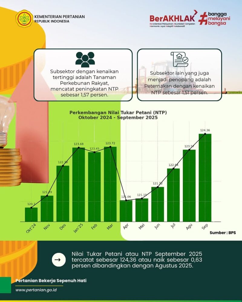 koransakti.co.id, Jakarta- Pada September 2025, BPS mencatat NTP mencapai 124,36 atau naik 0,63% dibanding bulan sebelumnya.