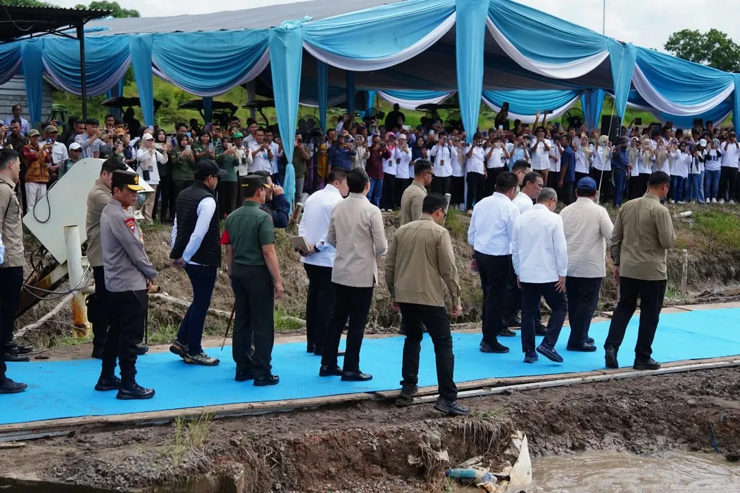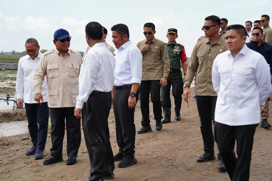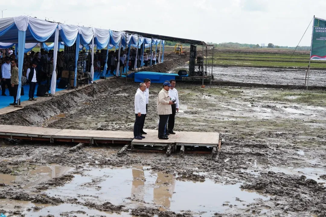Di lokasi ini, Presiden Prabowo menerima laporan dari Menteri Pertanian terkait penyiapan lahan dan sistem irigasi untuk pengembangan sawah seluas 105.000 hektare yang sebelumnya merupakan lahan rawa tidak produktif.