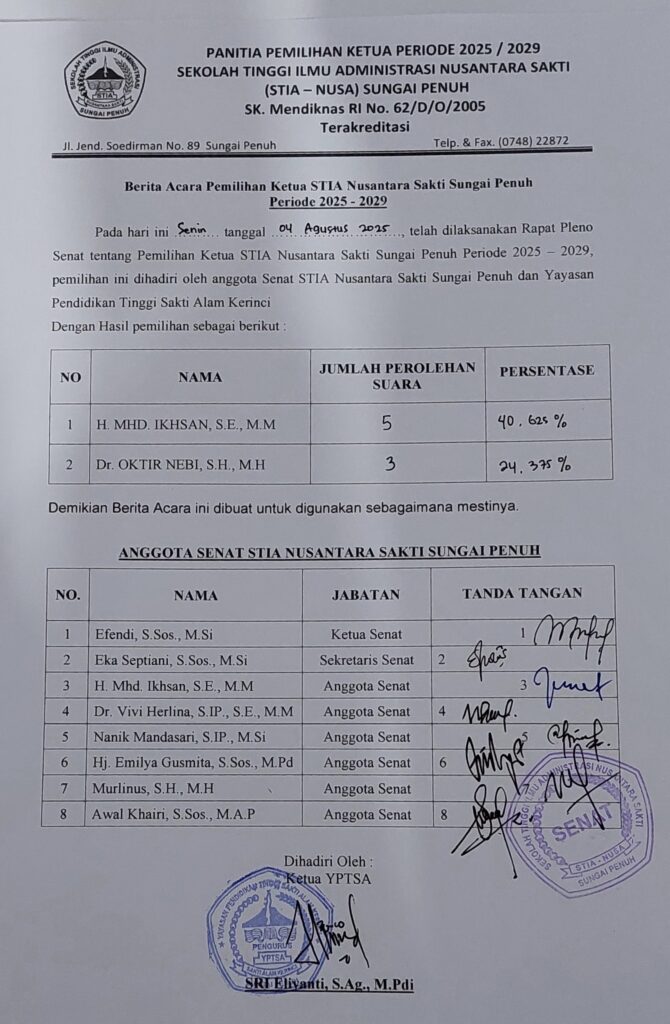 Koran Sakti.co.id, Sungai Penuh – Proses demokrasi pemilihan Ketua Sekolah Tinggi Ilmu Administrasi Nusantara Sakti (STIA NUSA) Sungai Penuh periode 2025–2029 telah dilaksanakan pada Senin, 4 Agustus 2025.