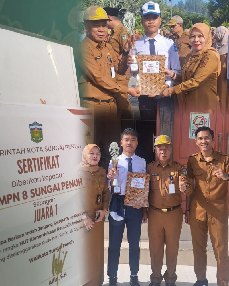 koransakti.co.id, Sungai Penuh- Satu lagi prestasi gemilang berhasil di raih oleh dunia pendidikan Kota Sungai Penuh. Tim Barisan Indah SpEnLa (SMPN 8 SNP Plus Kota Sungai Penuh) sukses meraih Juara 1 Barisan Indah Tahun 2025 untuk jenjang SMP/sederajat.