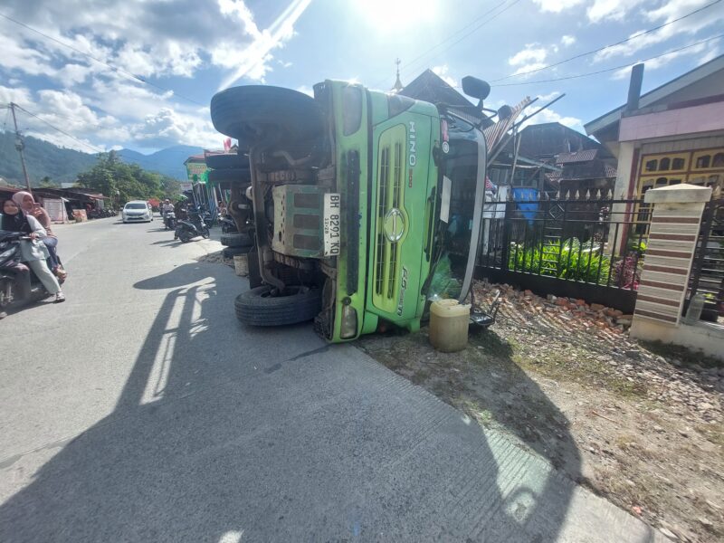 Menurut keterangan di lokasi, insiden bermula saat sopir truk hendak menunaikan salat di masjid sekitar. Ia memarkirkan kendaraannya di tepi jalan, namun tanpa disadari salah satu roda truk terperosok ke dalam drainase yang tertutup semen. Akibatnya, kendaraan besar bermuatan sawit itu kehilangan keseimbangan dan terguling ke arah rumah warga.