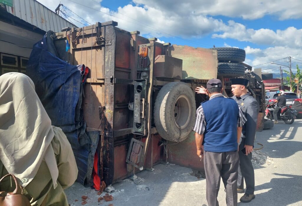 Koransakti.co.id, Sungai Penuh – Sebuah truk bermuatan Inti sawit seberat 22 ton terguling di Jalan Husni Thamrin, Desa Sumur Anyir, Kota Sungai Penuh, Rabu (15/10/2025) siang. Peristiwa ini mengundang perhatian warga dan pengguna jalan yang melintas di kawasan padat tersebut.